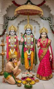 अर्थात-: जो पीतांबर धारण किए हुए हैं, उनके हाथो में धनुष-बाण हैं, वह बद्ध पद्मासन की मुद्रा में विराजित हैं। जिनके प्रसन्नचित नेत्र नए-नए खिले हुए कमल पुष्प के समान आपस में स्पर्धा कर रहे हैं, जिनके बायीं ओर सीताजी विराजमान है और उनके मुख कमल मिले हुए हैं। हम उन नाना अलंकारों से विभूषित जटाधारी श्रीरामचंद्र का ध्यान करते है।