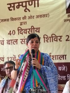 1993 में स्थापित, सम्पूर्णा दिल्ली में स्थित एक ऐसा गैर-सरकारी संगठन है जो महिलाओं और बच्चों को सशक्त बनाने के मिशन के साथ काम कर रहा है। इसकी संस्थापिका डॉ. शोभा विजेन्द्र तीन दशकों से भी अधिक समय से महिलाओं के अधिकारों के लिए लड़ रही सामाजिक कार्यकर्ता हैं। गर्मियों की छुट्टियों में आयोजित 40 दिवसीय ‘महिला एवं बाल संस्कार शिविर’ उनके द्वारा चलाए जा रहे कार्यक्रमों का ही एक हिस्सा है। इस शिविर में प्रतिभागियों को प्रार्थना, मंत्रोच्चारण, वैदिक श्लोक, शिष्टाचार तथा सामाजिक-सांस्कृतिक गतिविधियों के माध्यम से नैतिक एवं आध्यात्मिक विकास की दिशा में मार्गदर्शन दिया जाता है। सेल्फ डिफेंस सिखाया जाता है और विभिन्न सृजनात्मक गतिविधियों द्वारा उन्हें रचनात्मक रूप से सक्षम बनाया जाता है। 40 दिन के शिविर का सोलहवां व सत्रहवां दिन जयपुर में स्थित सोहम फार्म में 8 और 9 जून 2025 को संपन्न हुआ। पहले सत्र का विषय था-‘मां और प्रकृति के सान्निध्य में संस्कारों की यात्रा।’ कार्यक्रम का शुभारंभ दीप प्रज्वलन से हुआ, जिसमें राष्ट्रीय प्रभारी, हरियाणा, श्री सतीश पूनिया, विधायक एवं आध्यात्मिक संत स्वामी श्री बालमुकुंदाचार्य, राष्ट्रीय महिला मोर्चा उपाध्यक्ष श्रीमती पूजा कपिल मिश्रा तथा संस्थापिका डॉ. शोभा विजेन्द्र की गरिमामयी उपस्थिति रही। डॉ. शोभा विजेन्द्र, संस्थापिका सम्पूर्णा ने अपने विचार रखते हुए सनातन और पाश्चात्य संस्कृतियों के मूलभूत अंतर को स्पष्ट किया। उन्होंने बताया कि पाश्चात्य संस्कृति व्यक्ति को केंद्र में रखती है, जबकि सनातन संस्कृति परिवार, समाज और प्रकृति के सामूहिक उत्थान की बात करती है। उन्होंने कहा कि पहले हमारी मुख्य केंद्रबिंदु महिला थी, फिर समझ आया कि हम उसकी स्थिति में चाहे कितना ही सुधार क्यों न कर लें, जब तक कि उसका परिवार उसके साथ नहीं होगा, उसके विकसित होने से कोई सुधार न होगा। तब हमने महिला को केंद्र में रखकर परिवार को बेहतर बनाने की दिशा में काम करना शुरू किया।’ स्वामी श्री बालमुकुंदाचार्य जी ने कहा कि “गृहिणी के बिना कोई भी घर पूर्ण नहीं होता।” उन्होंने महिलाओं को समाज और राष्ट्र निर्माण की आधारशिला बताया और वर्तमान समय में सोशल मीडिया के दुष्प्रभावों से सचेत रहने की सलाह दी। श्री सतीश पूनिया जी ने केंद्र सरकार द्वारा चलाई जा रही महिला सशक्तिकरण योजनाओं की जानकारी दी और कहा कि पहले जहां बेटियों को जन्म से पहले ही रोक दिया जाता था, आज वही बेटियां राष्ट्र की शक्ति और सम्मान बन रही हैं। राष्ट्रीय महिला मोर्चा उपाध्यक्ष, श्रीमती पूजा कपिल मिश्रा ने कहा कि मां ही सम्पूर्ण सृष्टि का मूल है।