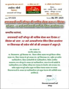 समाजवादी पार्टी जौनपुर की मासिक बैठक 7 सितंबर को