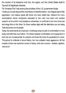 यह पत्र अमेरिकी राष्ट्रपति डोनाल्ड ट्रंप के राष्ट्र के नाम संबोधन से ठीक पहले जारी किया गया। इस पत्र मे मुख्य बातें जो उन्होंने अमेरिकी लोगों से कहीं हैं –
